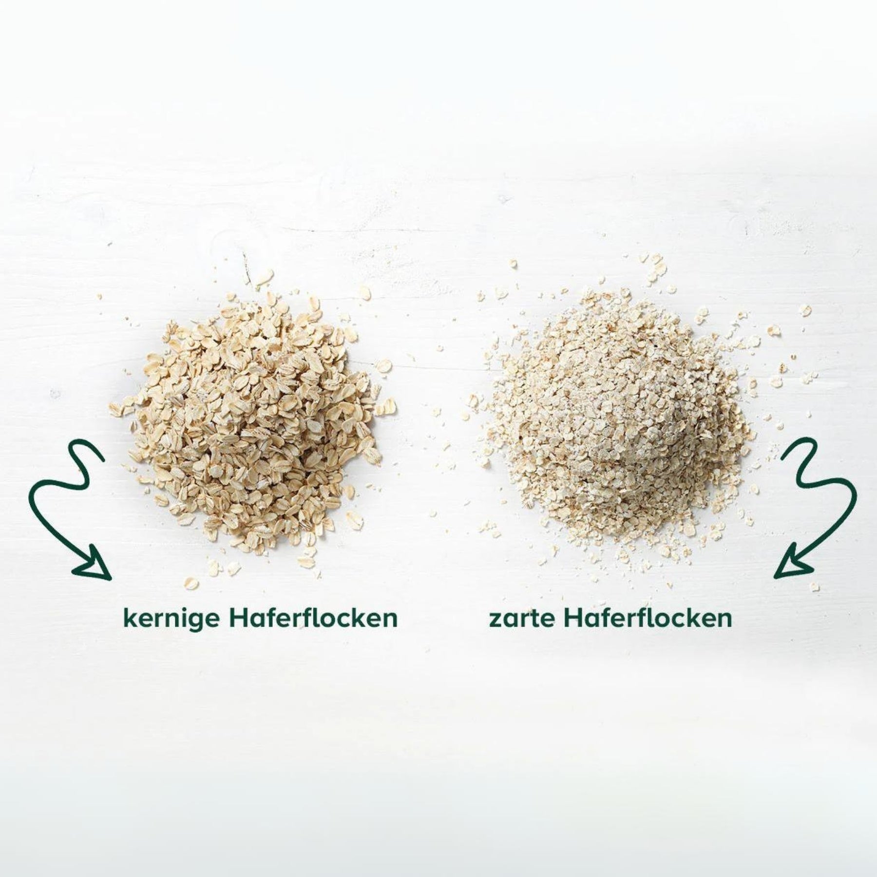 Zarte Haferflocken entstehen, wenn das gewalzte Korn anschließend noch geschnitten wird. Bei guter Qualität quellen so die Haferflocken leichter auf, werden im Zusammenspiel mit Flüssigkeit cremig und haben dennoch einen etwas kernigen Biss. Zarte Haferflocken sind deshalb die perfekten Overnight Oats Haferflocken. Bei der Zubereitung als Overnight Oats quellen sie so auf, dass eine lockere und smoothe Konsistenz entsteht. Der leichte Biss geht dabei nicht verloren.