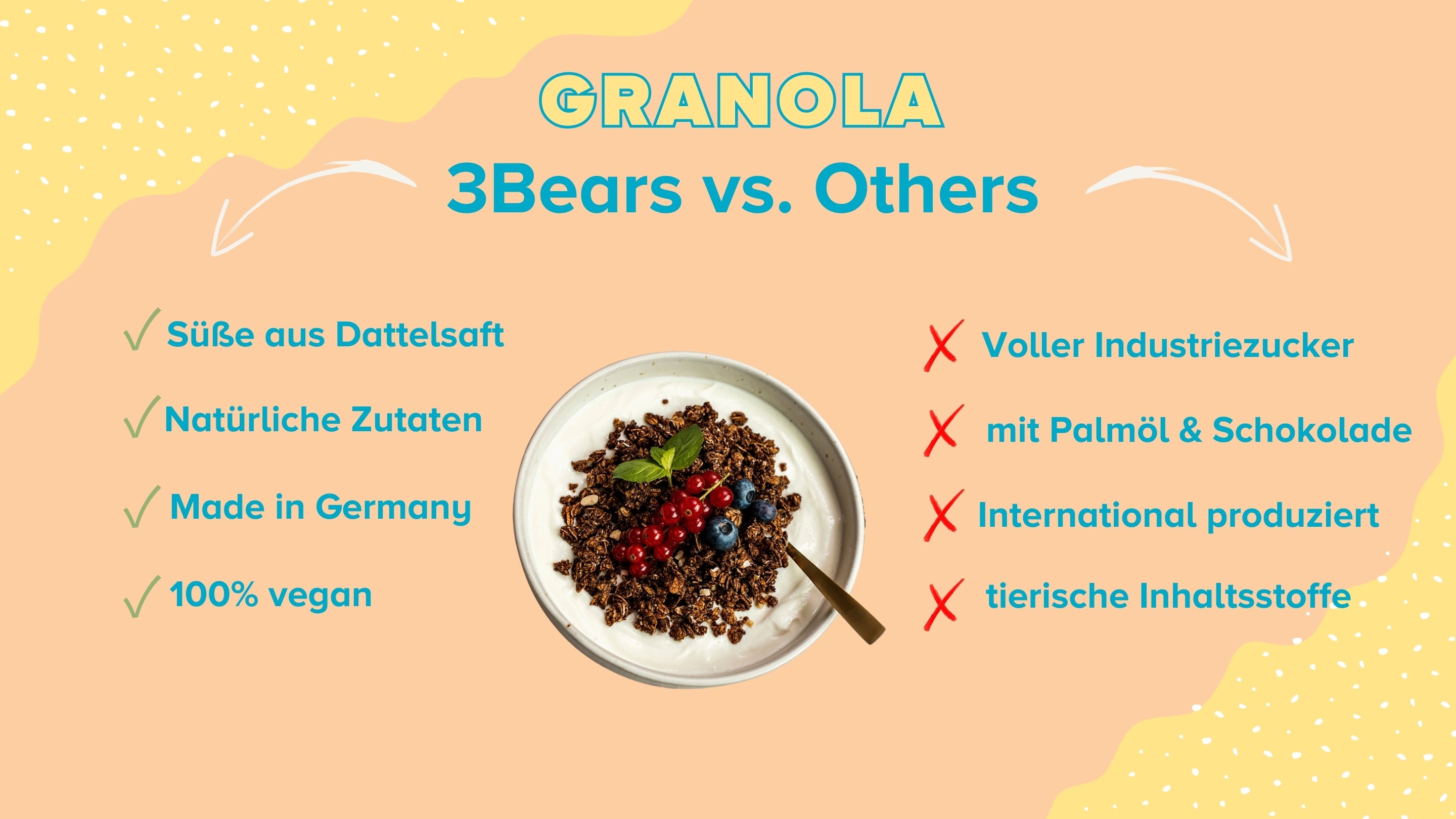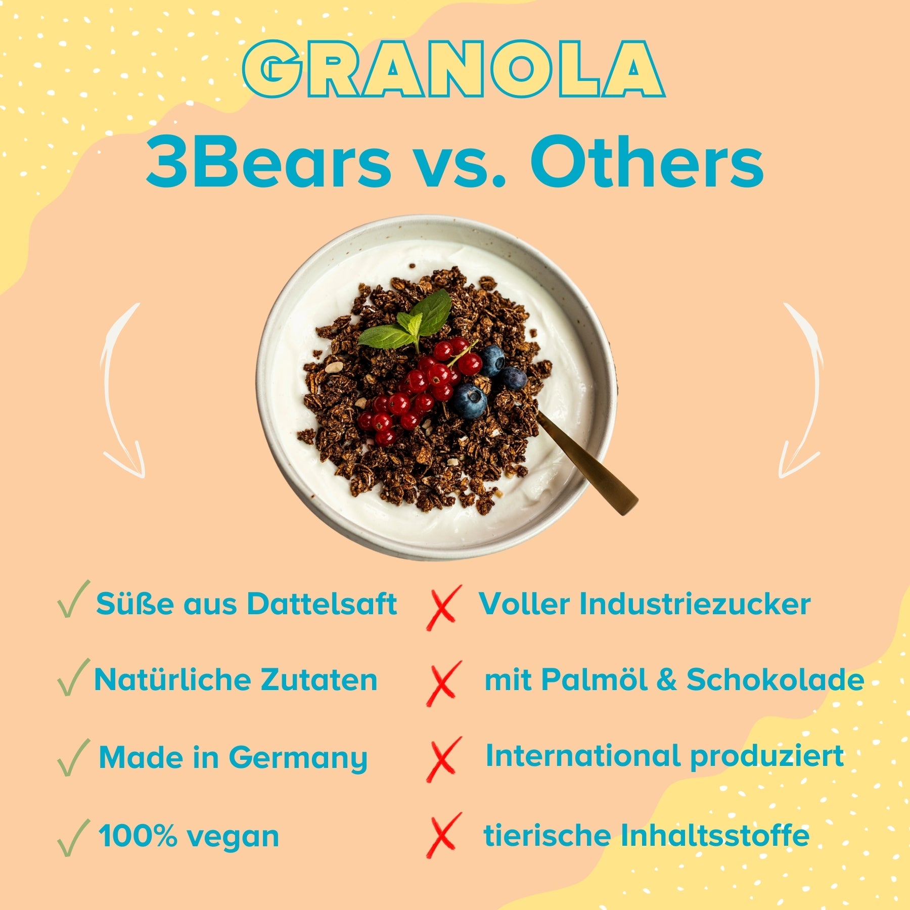 In der Vergangenheit habe ich schon öfters mit 3Bears im Rahmen von Kooperationen zusammengearbeitet. 3Bears teilt meine Leidenschaft für hochwertige Lebensmittel, die nicht nur mega lecker, sondern auch vollwertig sind. Deswegen war ich so begeistert von der Idee ein Granola zu entwickeln, das genau diese beiden Komponenten miteinander vereint – es ist komplett ohne Industriezucker hergestellt und schmeckt wie selbst gebacken!