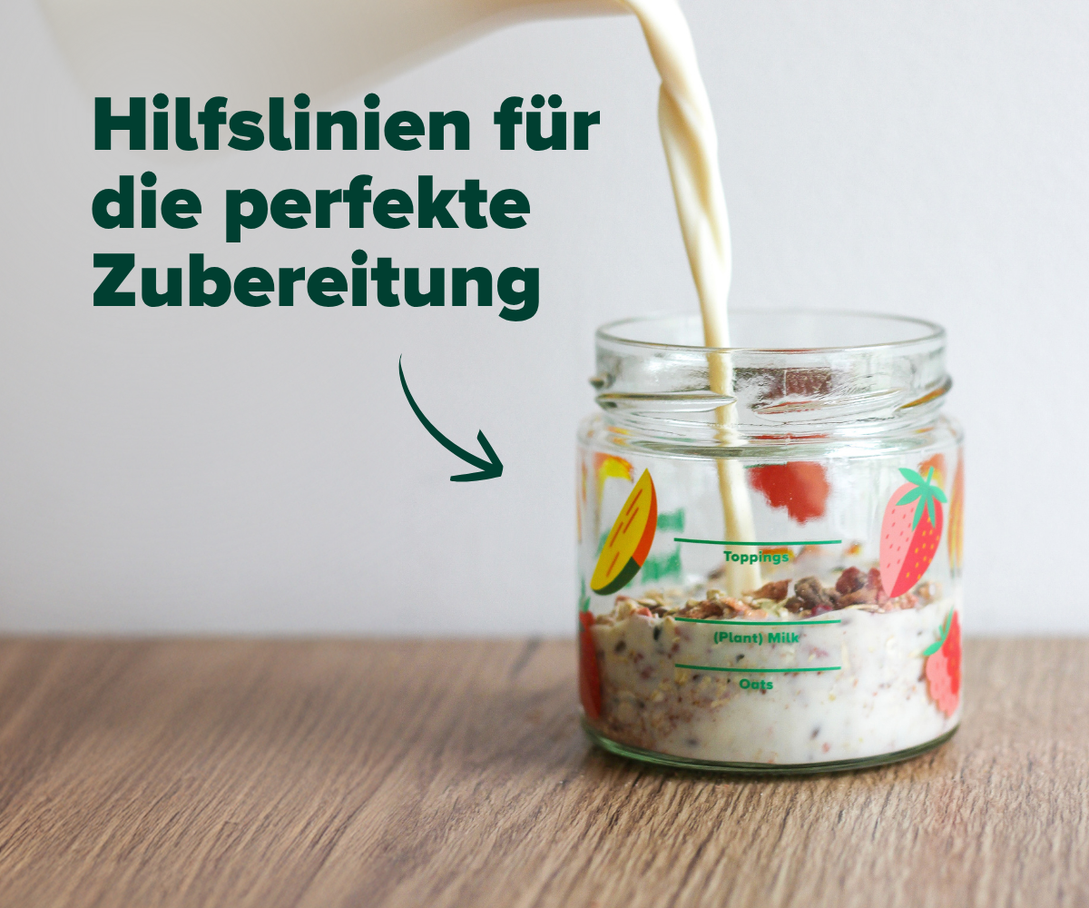 Unser sommerliches Overnight Oats Glas ist eine echte Arbeitserleichterung: Dank der praktischen Markierungen dosierst du 50 g Porridge-Mischung, 100 ml Flüssigkeit und deine Lieblings-Toppings ganz ohne Waage oder Messbecher. Danach einfach für mindestens 6 Stunden in den Kühlschrank stellen – fertig ist dein perfekt vorbereitetes Frühstück. Porridge verputzt? Das Glas ist easy zu reinigen – in der Spülmaschine oder per Hand.