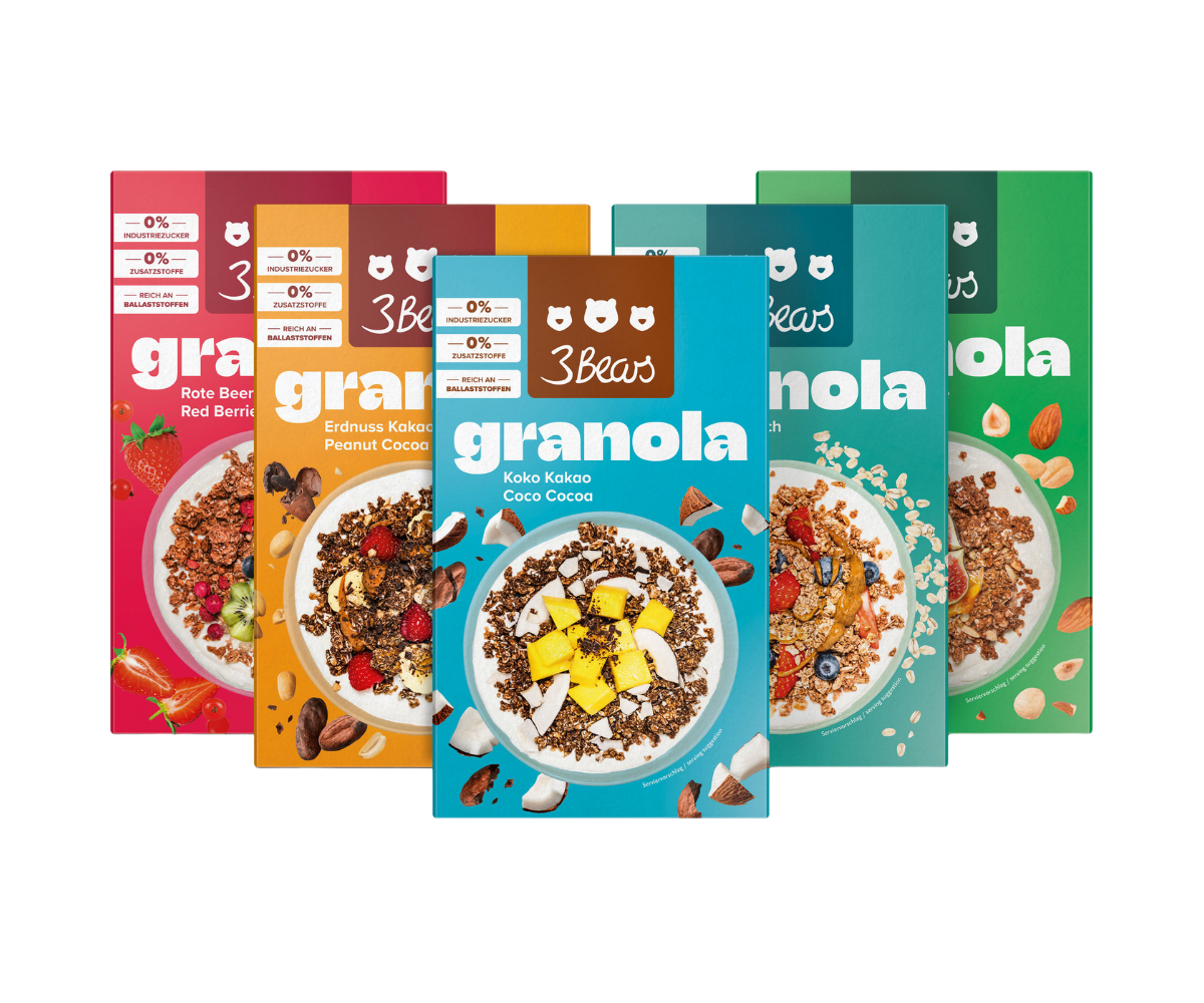 Granola can be conjured up from all 4 delicious 3Bears porridge varieties in no time at all. All you need is some coconut or linseed oil, agave syrup, chopped nuts of your choice and an oven. And as if by magic, our porridge mixtures turn into nutritious, crunchy fun!