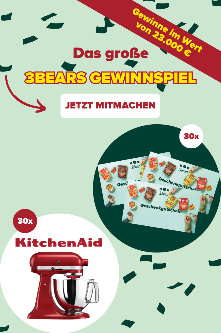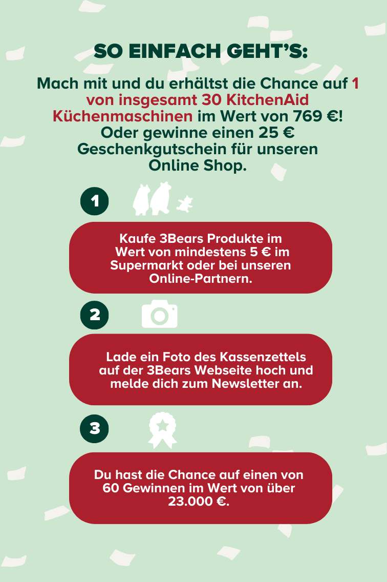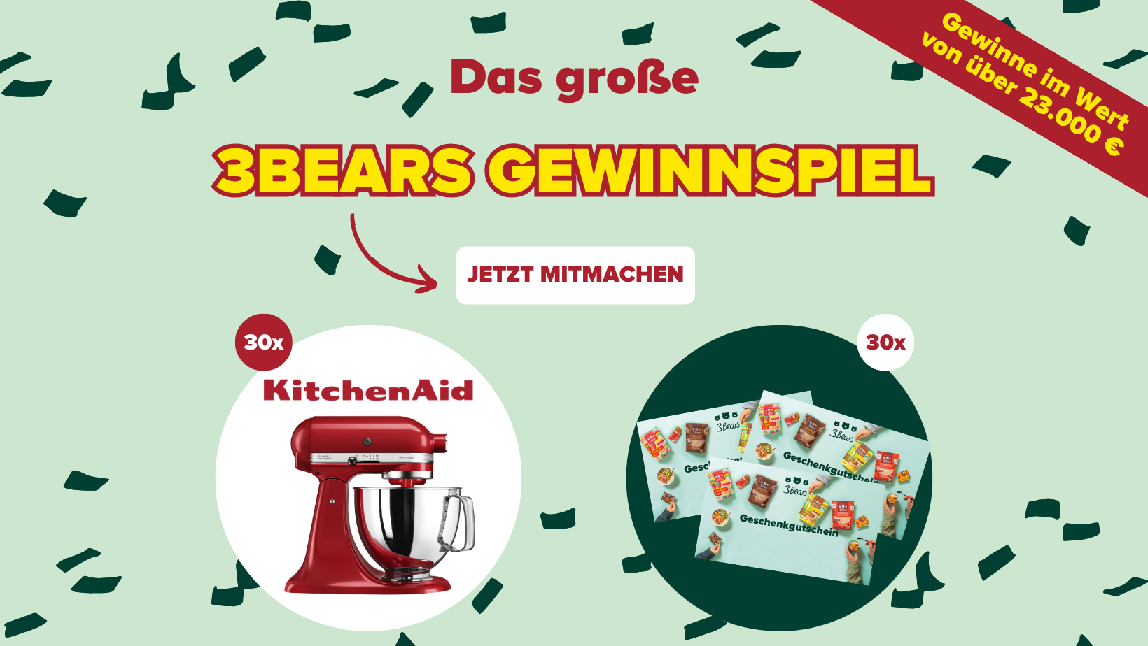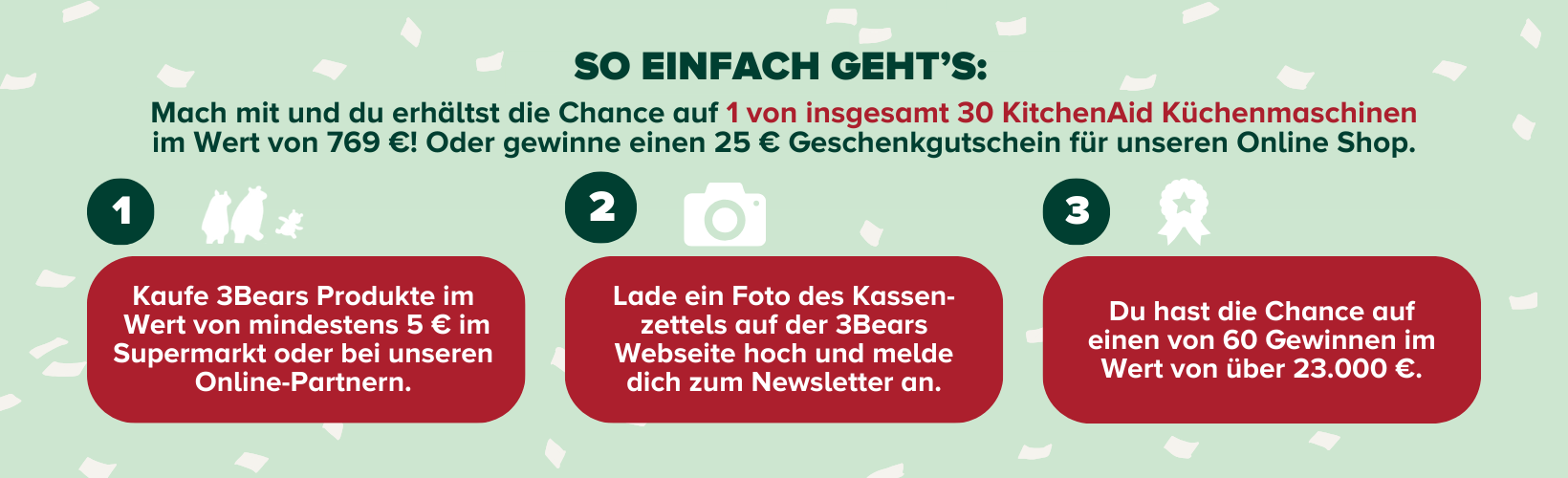 Shopping for Oat Heroes is now twice as worthwhile for you: In addition to the outrageously delicious 3Bears enjoyment, you have between January 1st. and March 31, 2024 you also have the chance to win 1 of a total of 30 KitchenAid food processors worth €769 each! But that's not all: we're also adding 30x €25 gift vouchers for our 3Bears online shop! Take part in our big 3Bears competition now.