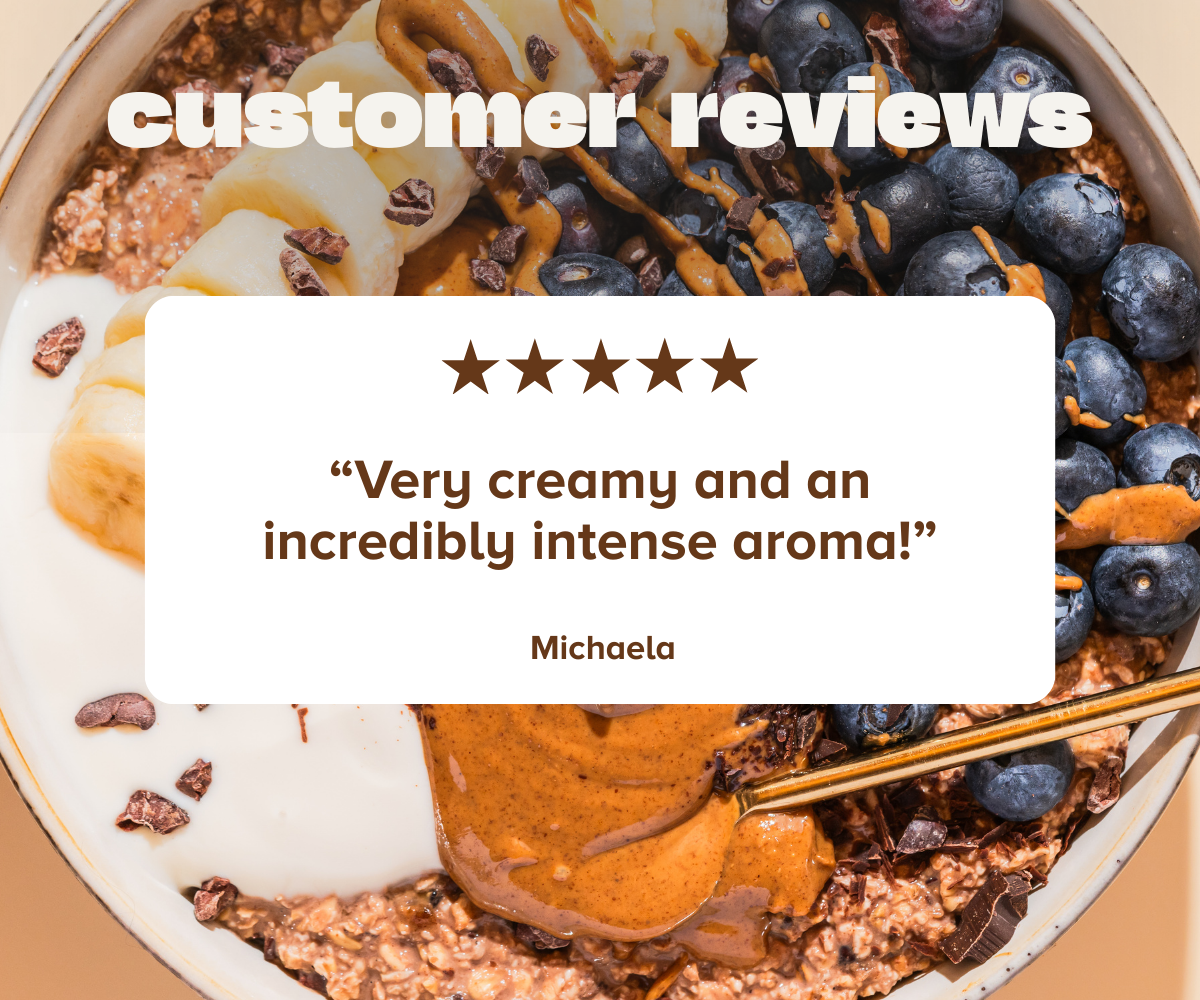 Our brown peanut butter is super smooth and creamy. The intense colour and full flavour come from roasting the unshelled nuts. The nut butter is completely natural and contains no added salt, oil, colouring, sugar or other not-so-clean ingredients. And what we like best: It can be drizzled perfectly and goes great with our oat products.