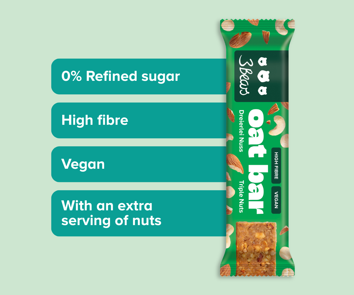 Our Oat Bars are more than just a snack – they are your faithful companion for on the go, after exercise or in between meals. Full of oats, nutty in taste and with the familiar 3Bears quality you love. Handy, delicious and always ready when you feel peckish.