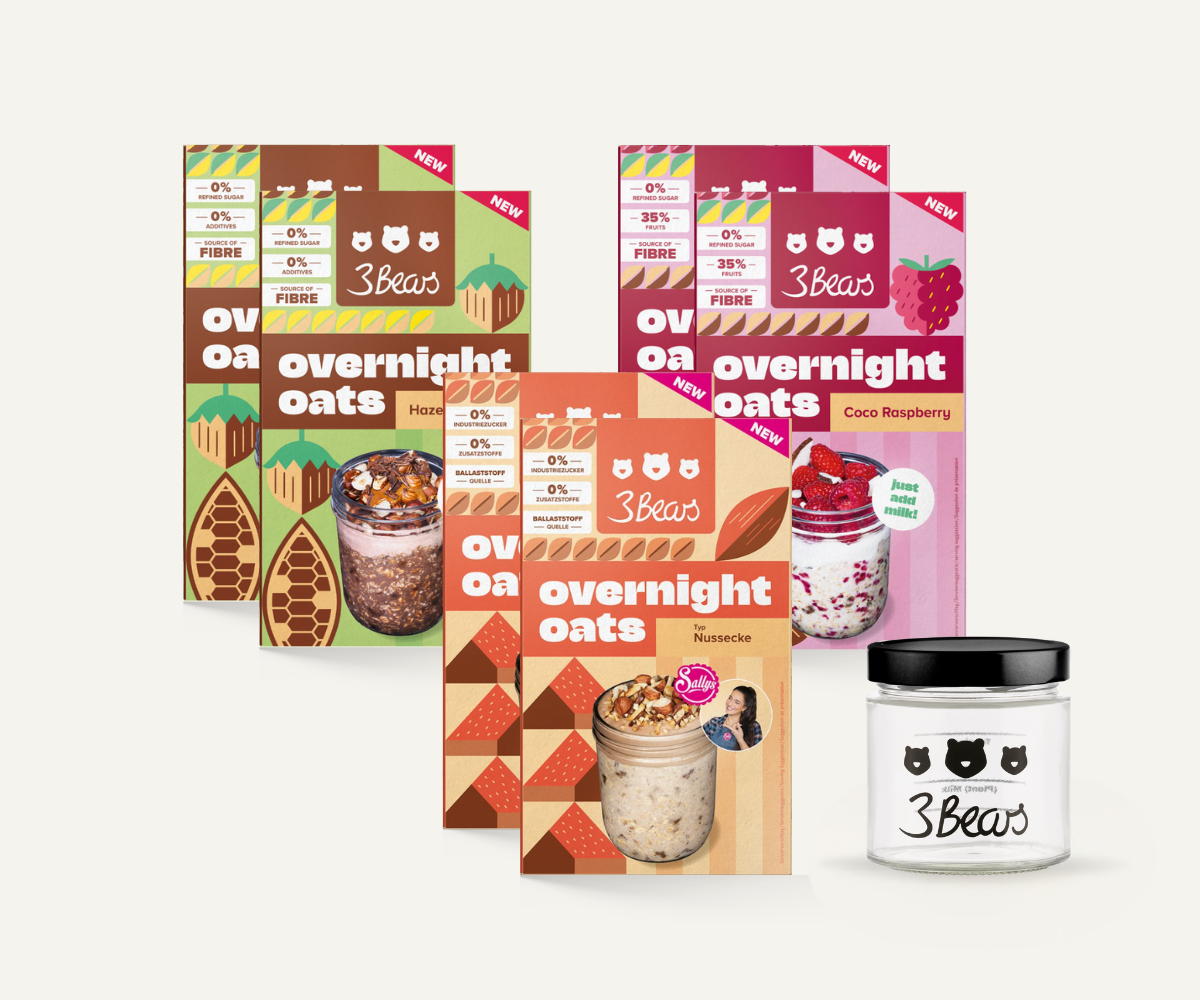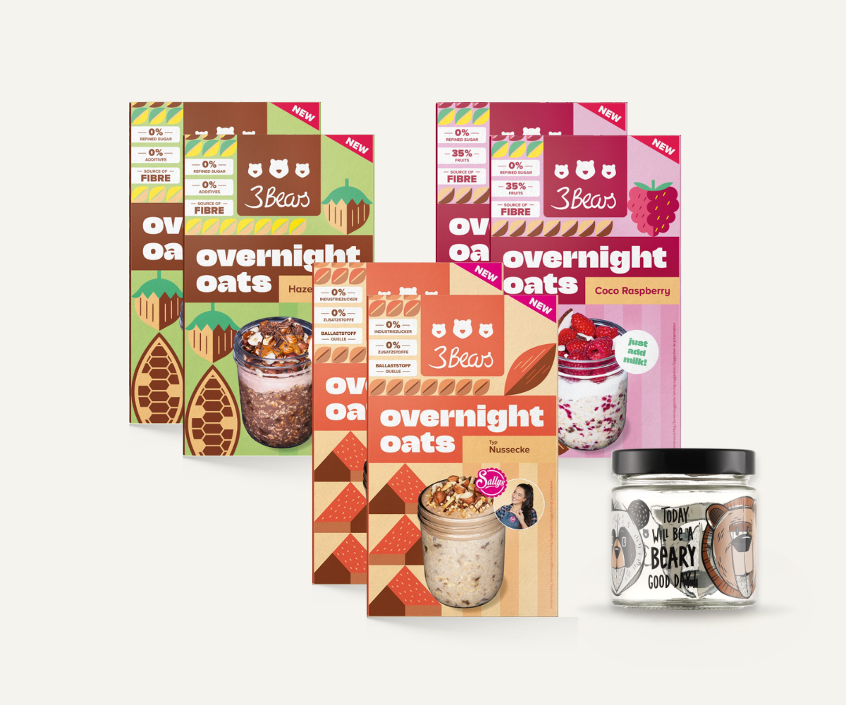 We founded 3Bears in 2016 because we were frustrated with how much sugar was in so many foods. We brought porridge to Germany because we think it's the perfect basis for a wholesome breakfast. You can now get pretty much everything to do with oats from us: overnight oats, bars, granola and accessories. And you can trust us to always stick to our principles. Our products contain no industrial sugar, no additives, they are always 100% plant-based and sustainability is deeply rooted in us.